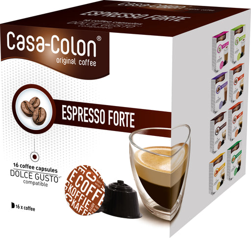 Beleef de intensiteit van koffie met de Dolce Gusto® Espresso Forte compatibele koffiecapsules van Casa Colon. Deze capsules bieden een krachtige ...